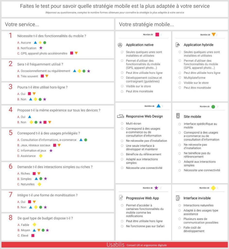 Pour conclure, de nombreuses solutions techniques sont à votre disposition pour concevoir le point de contact mobile. Pour vous aider à choisir celui qui correspondra à votre service, nous vous proposons ce test.